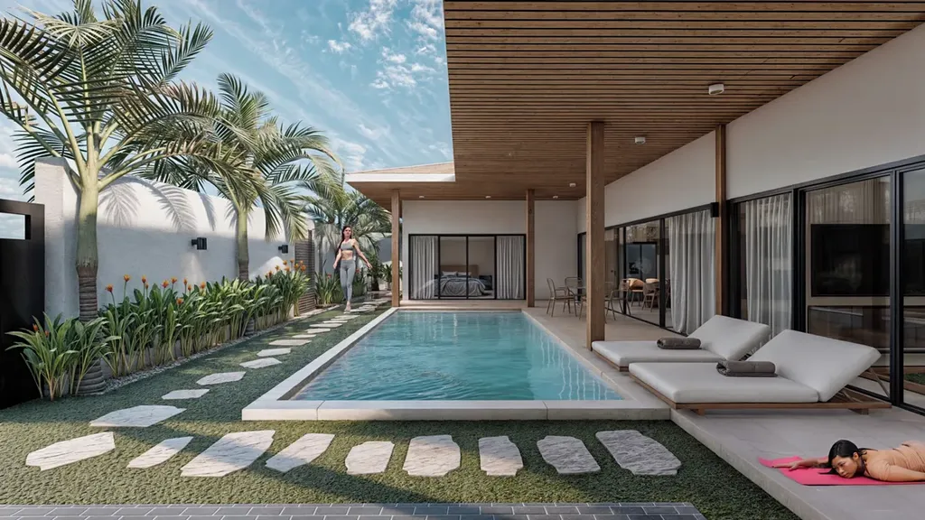 Každá vila se pyšní prostornou plochou 180 m² a disponuje 3 ložnicemi a 3 koupelnami, čímž zaručuje komfortní ubytování pro celou rodinu.