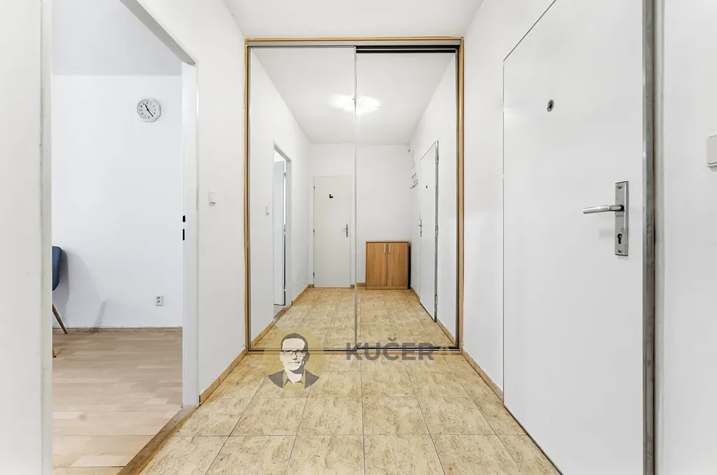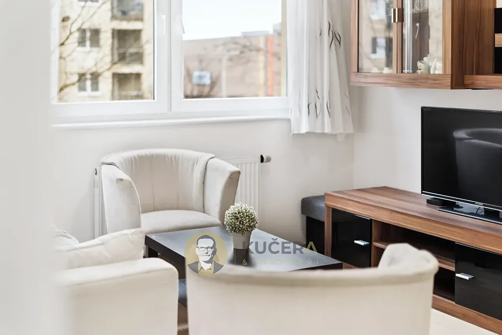 Byt je dispozičně přehledný. Obývací pokoj s kuchyňským koutem tvoří hlavní obytnou část, samostatná ložnice zajišťuje dostatek soukromí. Součástí bytu je nábytek na míru (šatní skříně v chodbě a ložnici), který zůstává součástí prodeje. Navíc je k bytu k dispozici zděný sklep o velikosti 3,9 m².