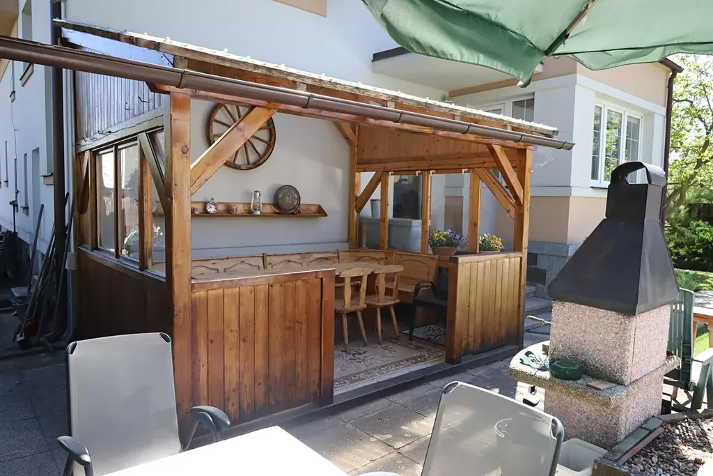 Venku u vily je venkovní posezení s krbem a venkovním krytým bazénem. Zahrada je rovinatá a krásná. Na zahradě se nachází vzrostlé dřeviny.
