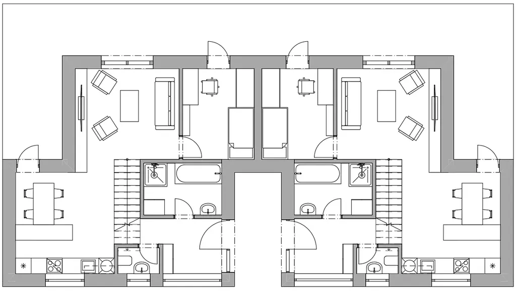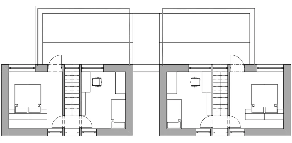 Dvojdům se samostatnými bytovými jednotkami, oddělenými zahradami, protihlukovými stěnami zajišťuje dostatek soukromí.