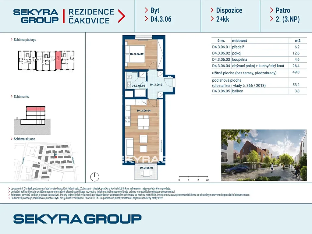 Dovolujeme si Vám nabídnout k prodeji byt 2+kk o výměře 53,2 m² s balkónem 3,8 m² v rezidenčním projektu Rezidence Čakovice.