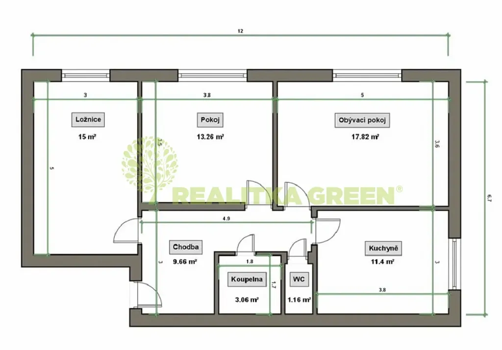 Celková plocha je 75,26 m2. Byt se nachází v 5. podlaží panelového zatepleného domu a je orientován na západní stranu.