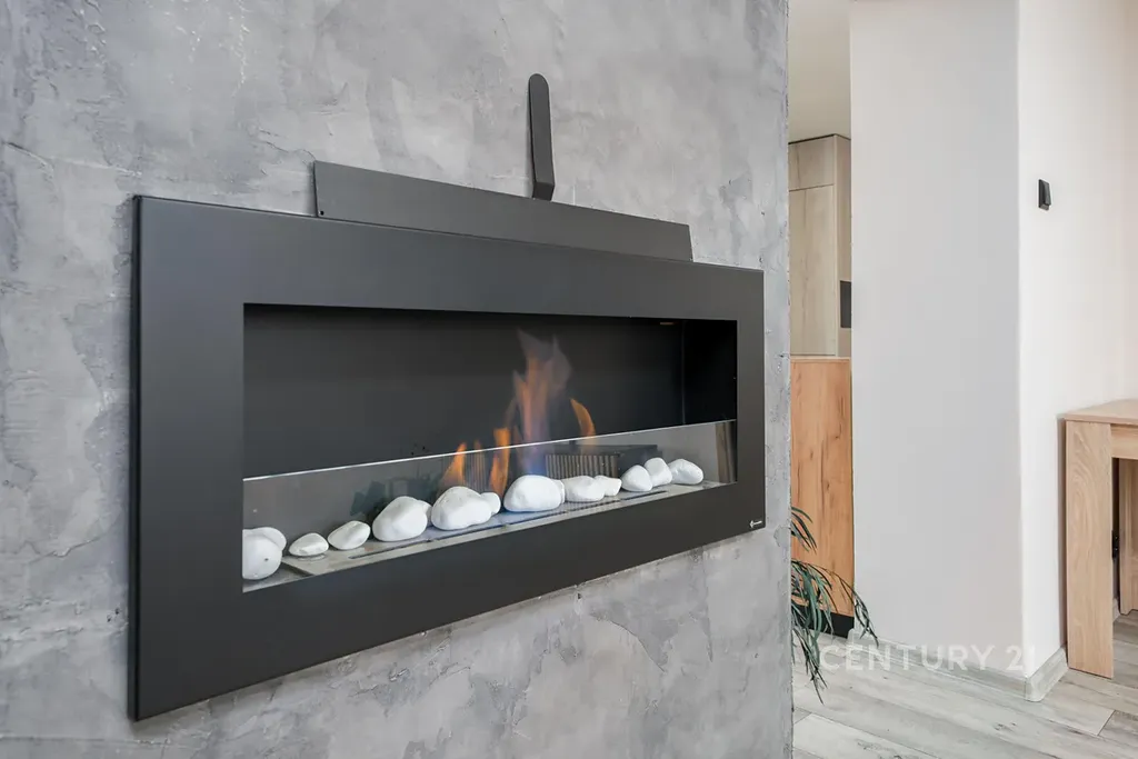 Dominantou obývacího pokoje je bio krb, který dodá večerům atmosféru i příjemné teplo.