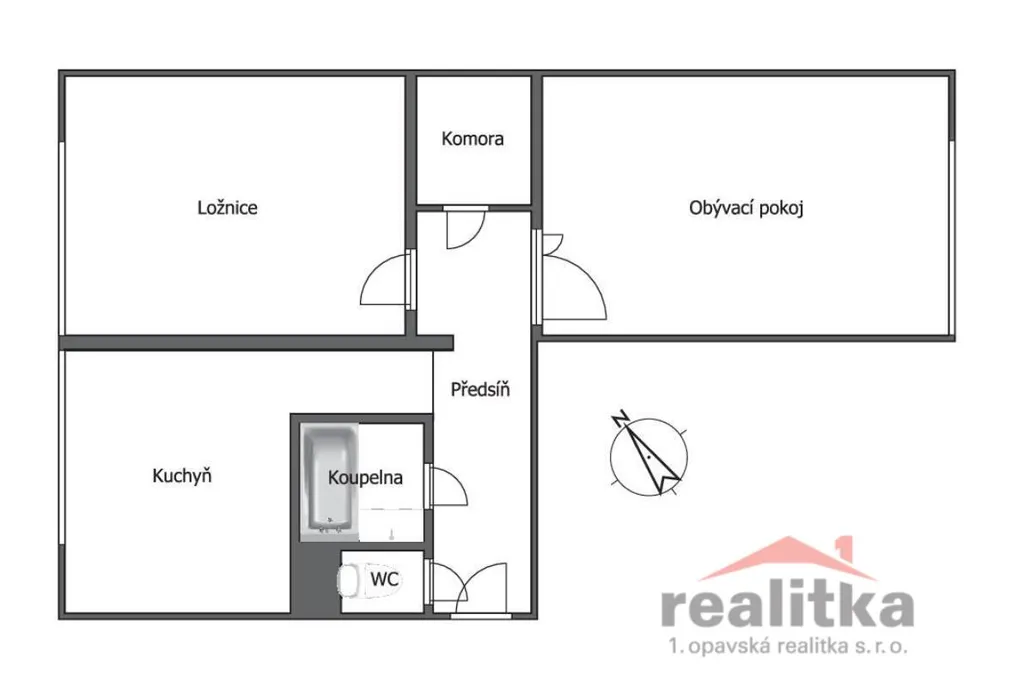 Dispozice bytu: vstupní předsíň, koupelna s vanou, samostatné WC, kuchyň s kuchyňskou linkou, obývací pokoj, ložnice a komora. Byt je vybaven plastovými okny se žaluziemi. Vytápění je řešeno centrálním ústředním topením. K bytu náleží sklepní kóje.