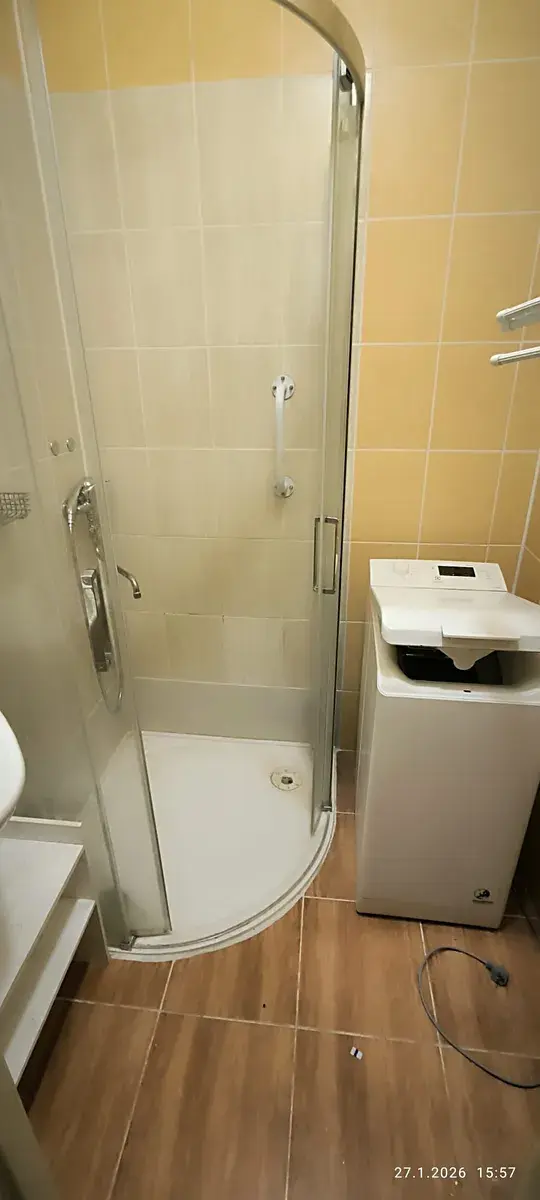 Kombinované bytové jádro koupelna se sprchovým koutem, prostorem na pračku, obklady a dlažba.