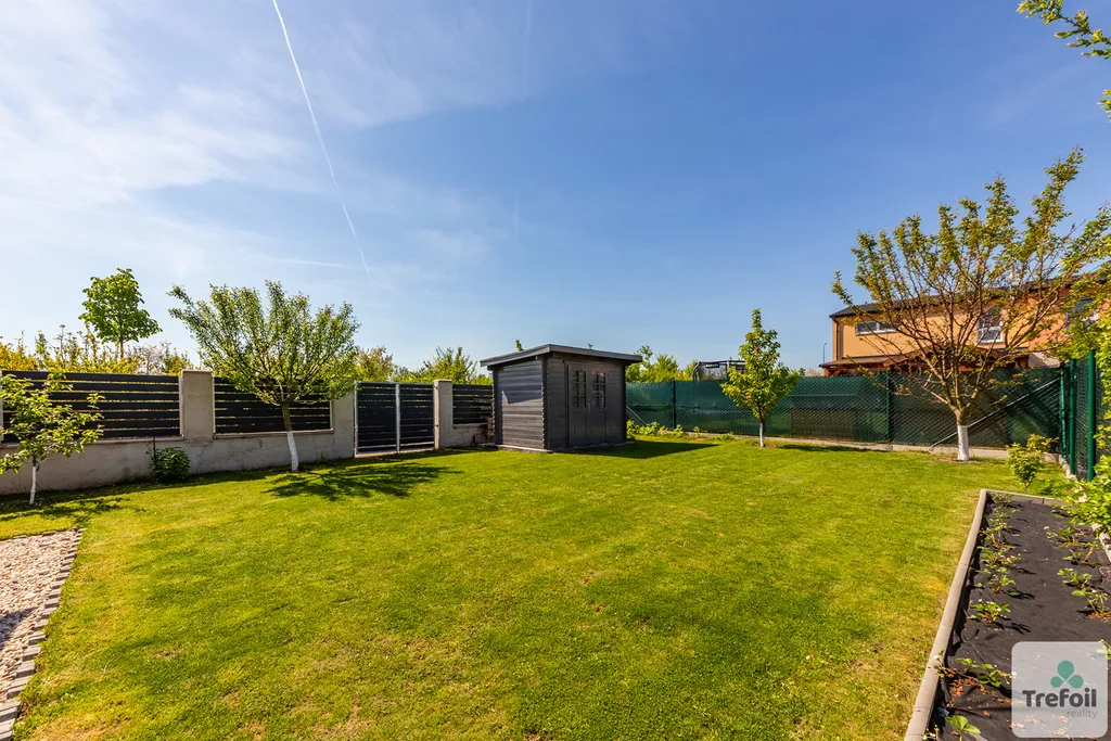 Zahrada pro relaxaci i zábavu o rozloze 256 m² je pečlivě upravená a nabízí ideální prostor pro odpočinek i rodinné aktivity. Jsou zde zasazené ovocné stromy a je tu i místo pro zeleninový záhon. Na terase si můžete vychutnat ranní kávu či večerní sklenku vína, zatímco děti si budou hrát na trávníku. Nářadí a zahradní potřeby lze pohodlně uložit v zahradním domku.