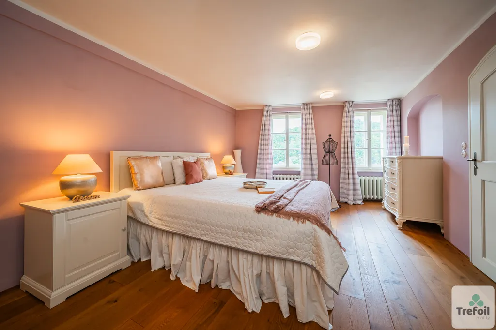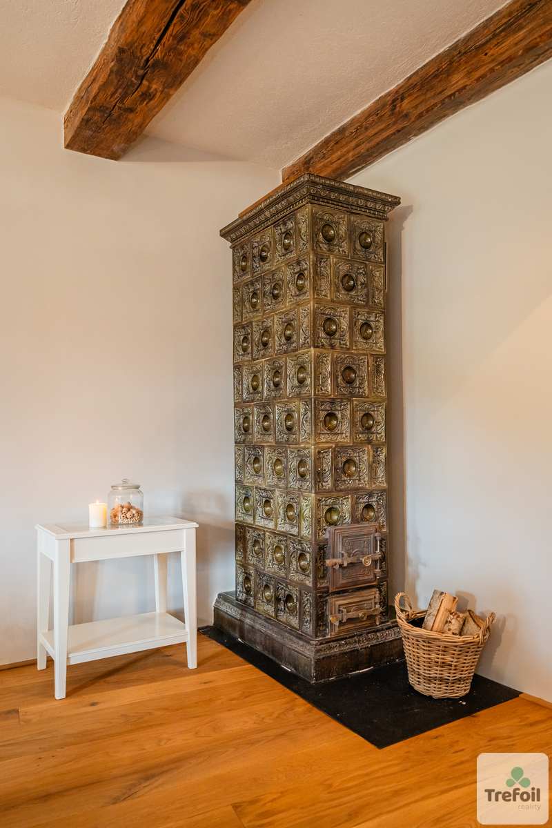 Každá místnost dýchá historií – masivní dubové podlahy, dřevěná špaletová okna, robustní dveře a travertinové parapety vytvářejí dojem noblesy a kvality.