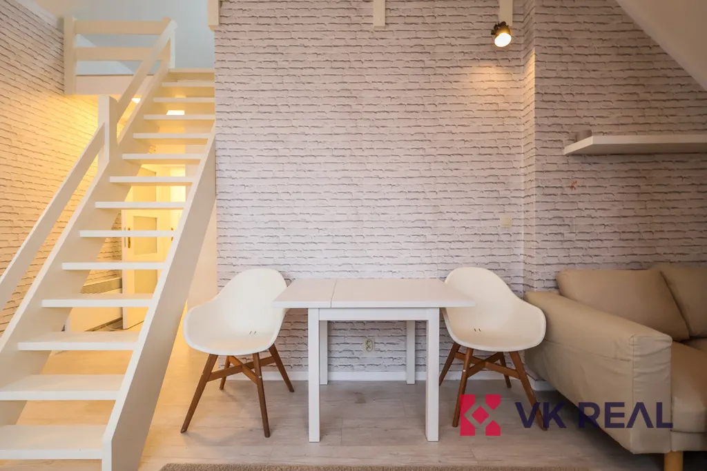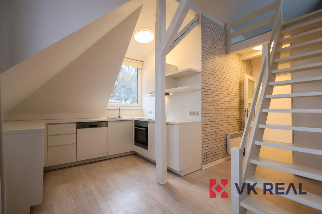 Designový byt se nachází ve třetím podlaží vily. Jedná se o loft zaujímající dispozici 1+kk a obytnou plochu 50m2 a pronajímá se zařízený dle fotografií. Dispozice je rozdělena následovně: ve spodním patře se nachází obývací pokoj s kuchyňskou linkou a koupelna se sprchou a WC. Horní část bytu tvoří patro pro spaní. Kuchyňská linka je plně vybavena spotřebiči značky Elektrolux, v úložných vestavěných prostorách v předsíni je umístěna pračka, též značky Elektrolux. Vytápění je řešeno elektrickými přímotopy, ohřev teplé vody elektrickým bojlerem.