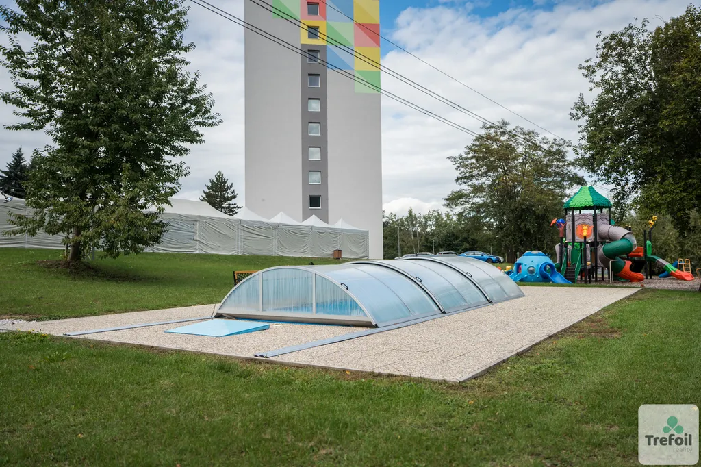 • Oplocený areál s bazénem, hřištěm a grill pointy