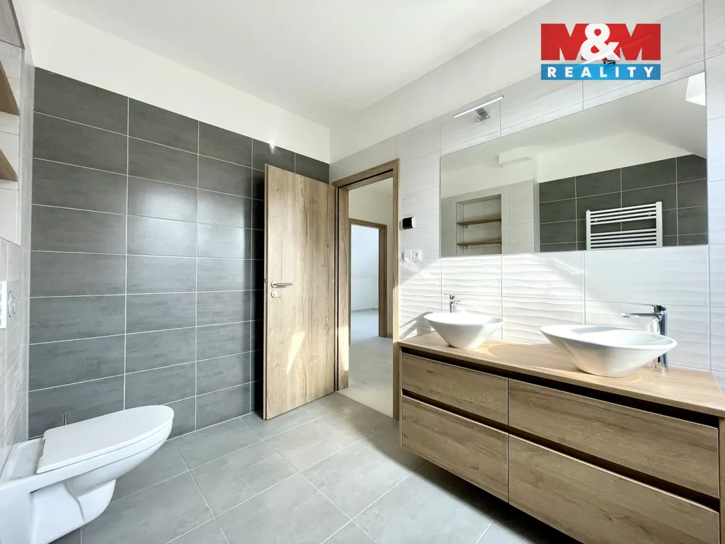 V přízemí se nachází koupelna se sprchovým koutem a WC, v patře pak druhá koupelna s vanou, dvěma umyvadly a WC. Praktická technická místnost nabízí prostor pro pračku, sušičku i uskladnění věcí, další úložný prostor zajišťuje šatna v patře.