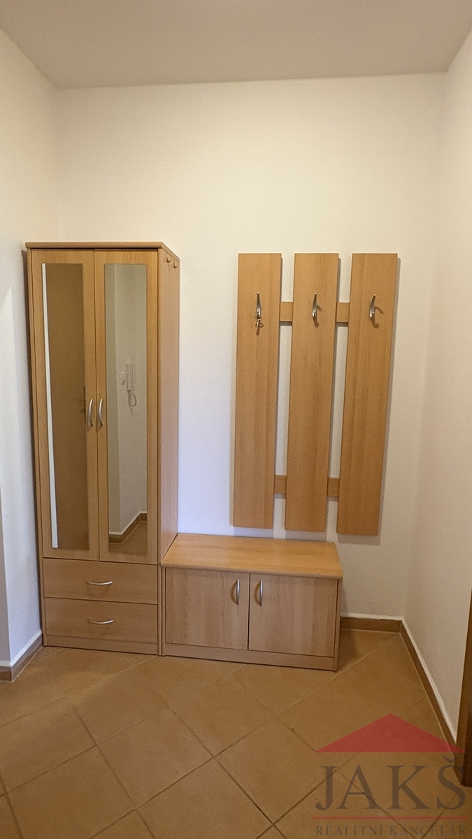 Popis: společná chodba se schodištěm a výtahem; byt 2+kk: předsíň 3,78 m2 (skříň s botníkem a věšákem), koupelna 3,42 m2 (sprchový kout, umyv. se zrcadlem, WC, topný žebřík, vývody na pračku), prostorný obývací pokoj 26,45 m2 (sedací souprava, jídelní a konferenční stůl, 4 židle, skříně, poličky) s kuch. koutem (kuch. linka s el. troubou a lednicí s mrazákem) a ložnice 9,02 m2. K bytu náleží vlastní sklep 3,71 m2 v suterénu domu a vymezené parkovací místo přímo před vchodem do domu.