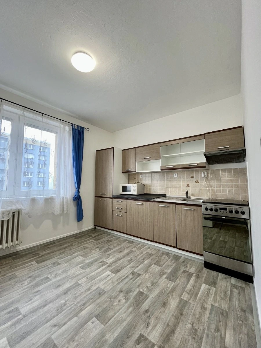 Byt se nabízí částečně vybavený. Součástí kuchyňské linky je elektrická trouba a plynový sporák, mikrovlnná trouba, lednice a jídelní stůl.
