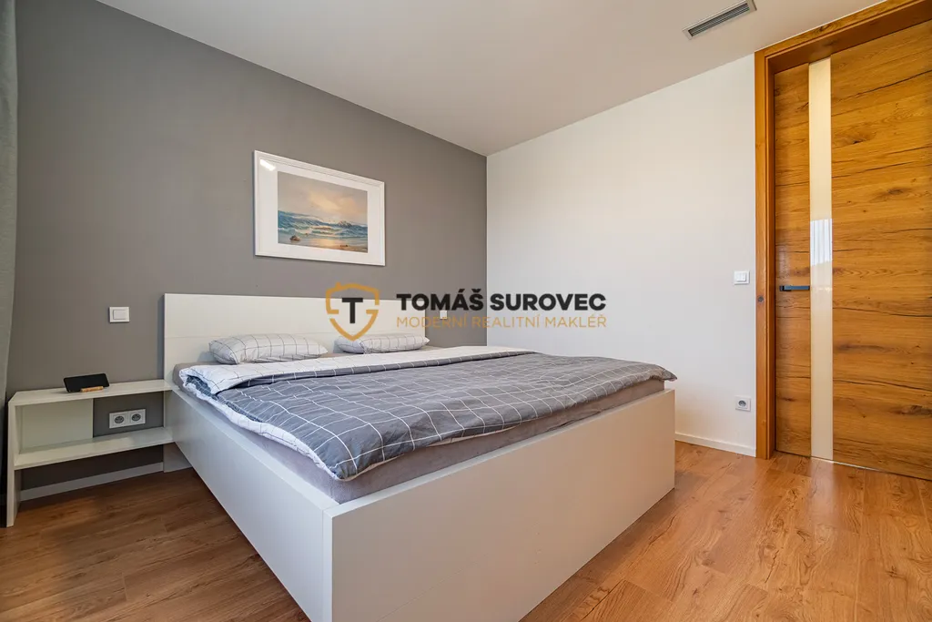 Soukromou část domu tvoří ložnice s vlastní šatnou a dva neprůchozí dětské pokoje. K dispozici je samostatné WC a luxusní koupelna s volně stojící vanou, sprchovým koutem a dvěma umyvadly.