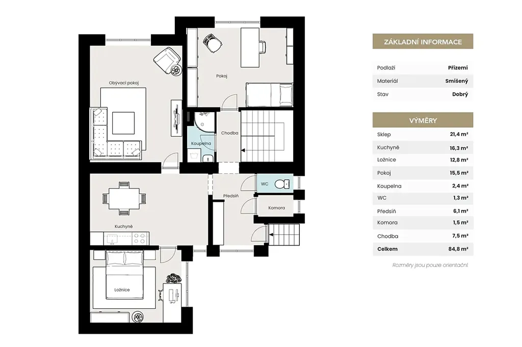 Dispozice domu je ideální i pro vícegenerační bydlení nebo rozdělení na dvě samostatné jednotky, například pro kombinaci vlastního bydlení a pronájmu. Dům má dvě nadzemní podlaží. V přízemí se nachází čtyři místnosti, z nichž tři jsou neprůchozí, což poskytuje dostatek soukromí pro jednotlivé členy rodiny. V patře je obývací pokoj, dvě ložnice, kuchyň a koupelna. V každém podlaží je k dispozici koupelna i samostatné WC, což výrazně zvyšuje komfort užívání domu. Nemovitost je téměř celá podsklepená a nabízí dostatek skladovacích prostor, technické zázemí i možnosti pro hobby či domácí dílnu.