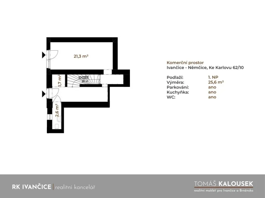 Ideální využití jako kancelář, sklad nebo třeba pro služby (kadeřnictví, kosmetický salón, nehtové studio, účetní / projekční kancelář, konzultační místnost, ateliér atp.).