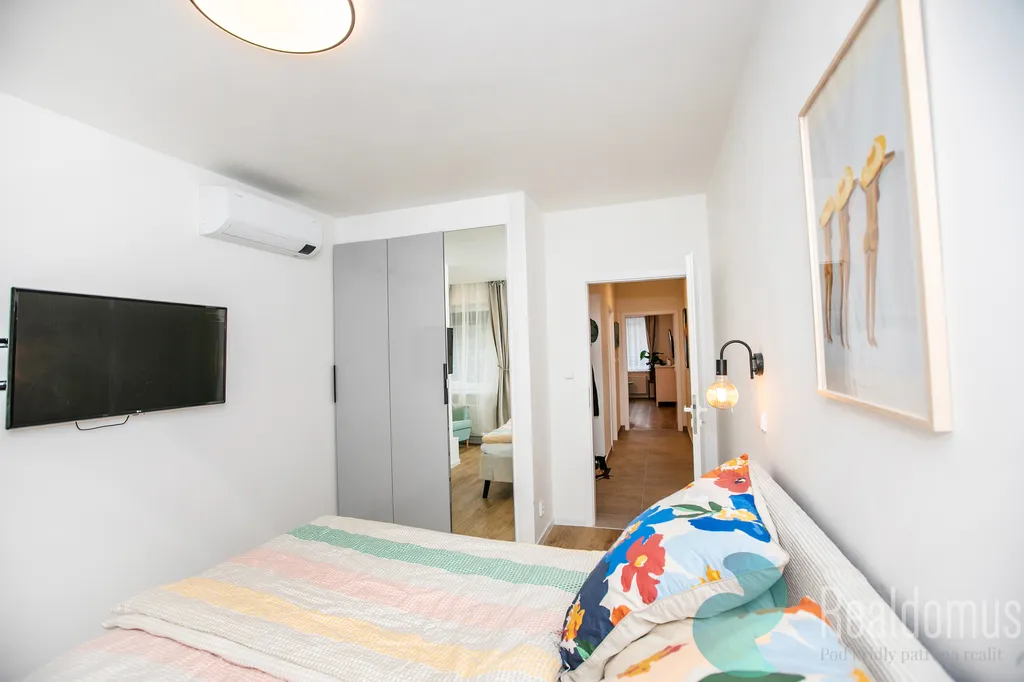 Interiér bytu zcela modernizován a nabízí příjemné zázemí pro bydlení. Vstup do bytu je po schodech. Chodbou se vchází do ložnice (14,7 m2) s vestavnými skříněmi a klimatizací. Obývací pokoj (24 m²) je vybaven plně zařízeným kuchyňským koutem obsahujícím lednici, myčku, varnou desku a troubu. Je zde i dostatečný prostor pro jídelní stůl. Vedle kuchyně se ukrývá komora na potraviny a jiné předměty.