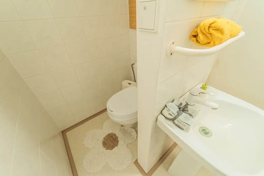 Dispozice bytu zahrnuje vstupní předsíň s velkou šatní skříní, koupelnu se sprchovým koutem a WC a prostorný pokoj s kuchyňskou linkou a dostatkem místa na spací kout i obývací část. Byt má zděné jádro a paní nájemnice, která v bytě dlouhodobě pobývá, se o něj velmi pečlivě stará.