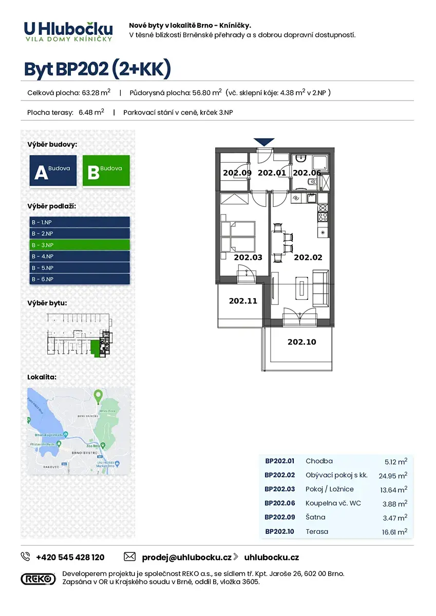 Nabízíme k prodeji byt o dispozici 2+kk s celkovou podlahovou plochou 52,42 m², který disponuje šatnou a jednou terasou o celkové výměře 16,61 m². Byt se nachází v 3.NP moderního terasového viladomu s výtahem v projektu U Hlubočku, dům B, v atraktivní lokalitě Brno–Kníničky. Orientace bytu je na východ s krásným výhledem na Mniší horu. Kupní cena zahrnuje parkovací stání v domě.
