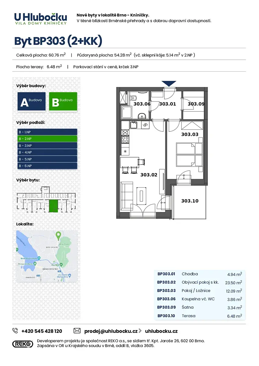 Nabízíme k prodeji byt o dispozici 2+kk s celkovou podlahovou plochou 49,14 m², který disponuje šatnou a jednou terasou o celkové výměře 6,48 m². Byt se nachází v 2.NP moderního terasového viladomu s výtahem v projektu U Hlubočku, dům B, v atraktivní lokalitě Brno–Kníničky. Orientace bytu je na východ s krásným výhledem na Mniší horu. Kupní cena zahrnuje parkovací stání v domě.