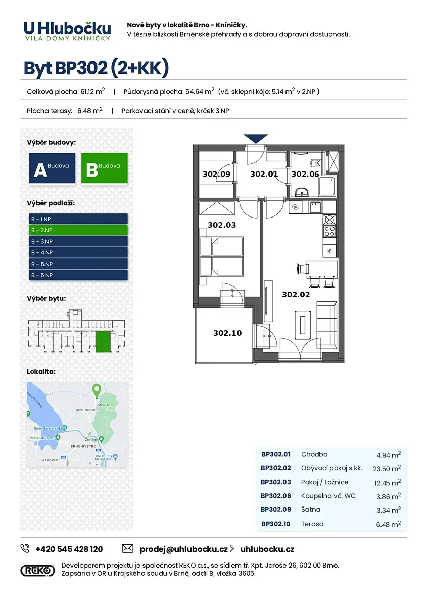 Nabízíme k prodeji byt o dispozici 2+kk s celkovou podlahovou plochou 49,50 m², který disponuje šatnou a jednou terasou o celkové výměře 6,48 m². Byt se nachází v 2.NP moderního terasového viladomu s výtahem v projektu U Hlubočku, dům B, v atraktivní lokalitě Brno–Kníničky. Orientace bytu je na východ s krásným výhledem na Mniší horu. Kupní cena zahrnuje parkovací stání v domě.