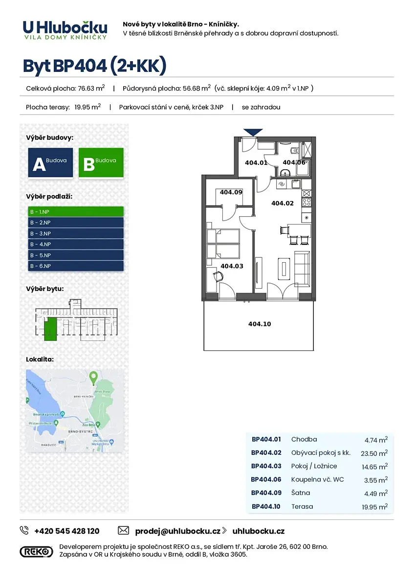 Nabízíme k prodeji byt o dispozici 2+kk s celkovou podlahovou plochou 52,59 m², který disponuje šatnou a jednou terasou o celkové výměře 19,95 m². Byt se nachází v 1.NP moderního terasového viladomu s výtahem v projektu U Hlubočku, dům B, v atraktivní lokalitě Brno–Kníničky. Orientace bytu je na východ s krásným výhledem na Mniší horu. Kupní cena zahrnuje parkovací stání v domě.