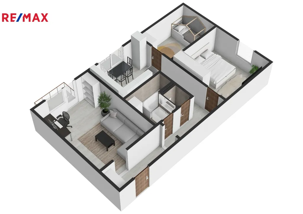 Předsíň, s chodbou o výměře 9 m2, se vstupem do obývacího pokoje o výměře 16 m2 a vstupem na balkón o výměře 5 m2, koupelna s velkou vanou 5 m2, samostatné WC 1 m2, ložnice 12 m2, pokoj 8 m2, samostatná kuchyně 9 m2 ( součástí je kuchyňská linka na míru, včetně spotřebičů - lednice, myčka, trouba, mikrovlnka, indukční varná deska).