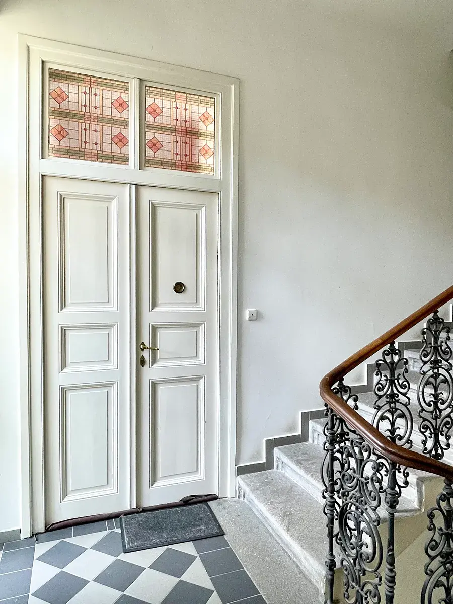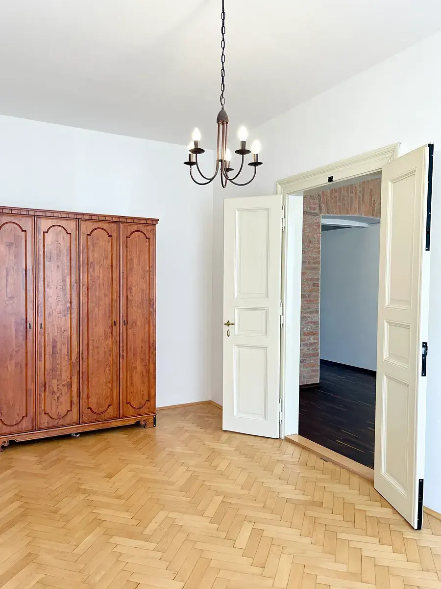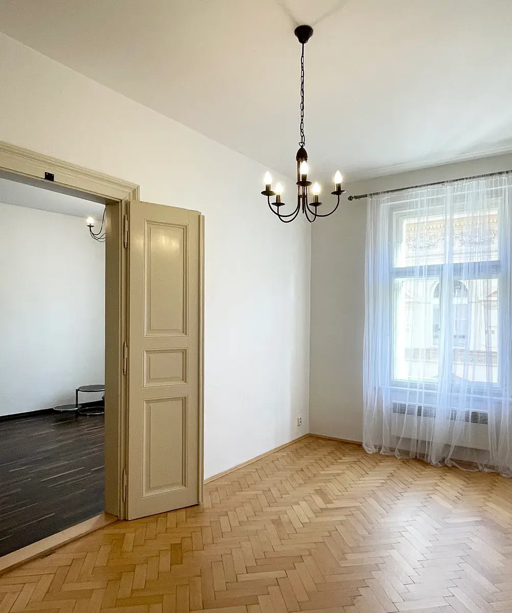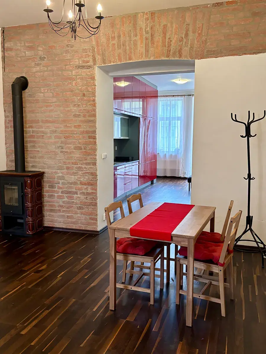 Byt se nachází v klidné ulici, což je velkou výhodou této žádané lokality. Vysoké stropy a velké místnosti dodávají interiéru pocit vzdušnosti a otevřeného prostoru.