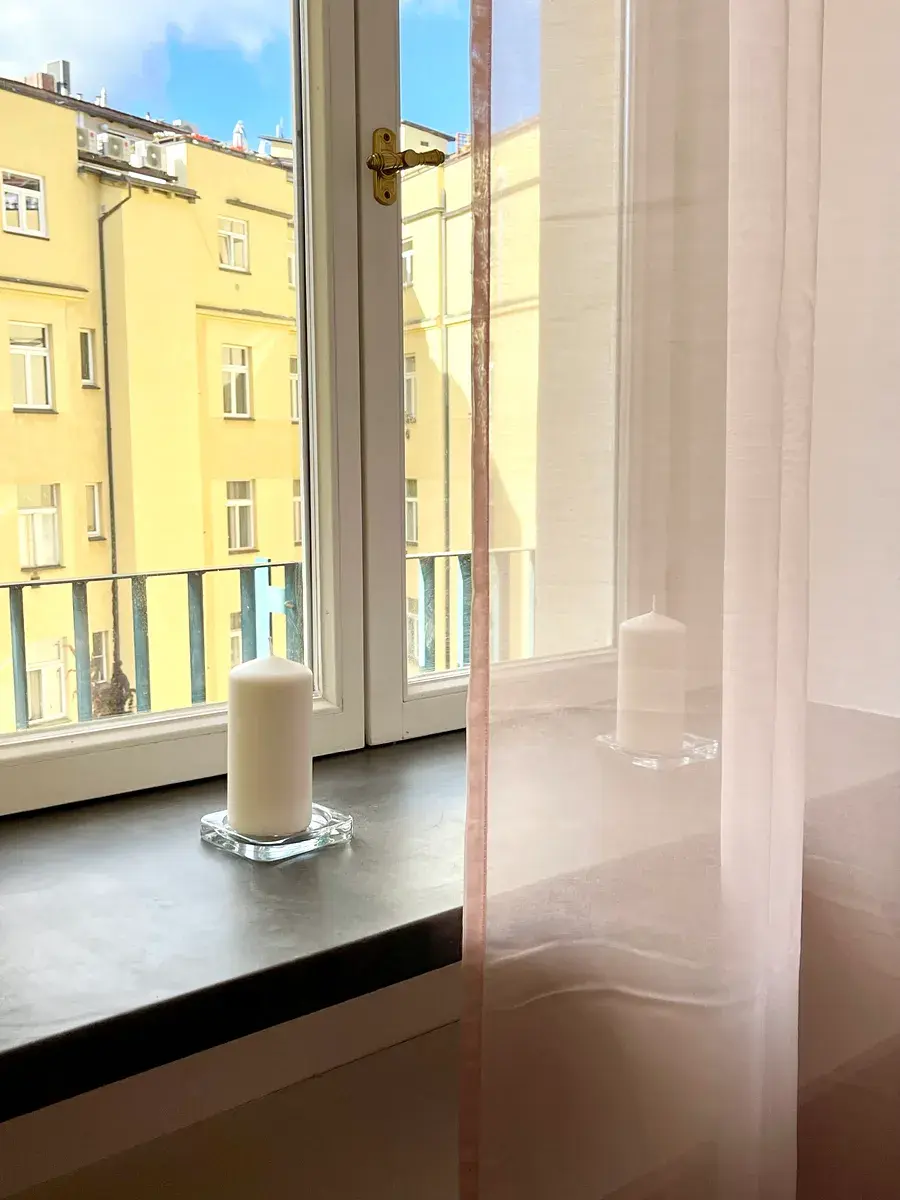 Z malého balkonu do vnitrobloku si můžete v teplých měsících vychutnat ranní kávu a klidnou atmosféru pražského dvora.