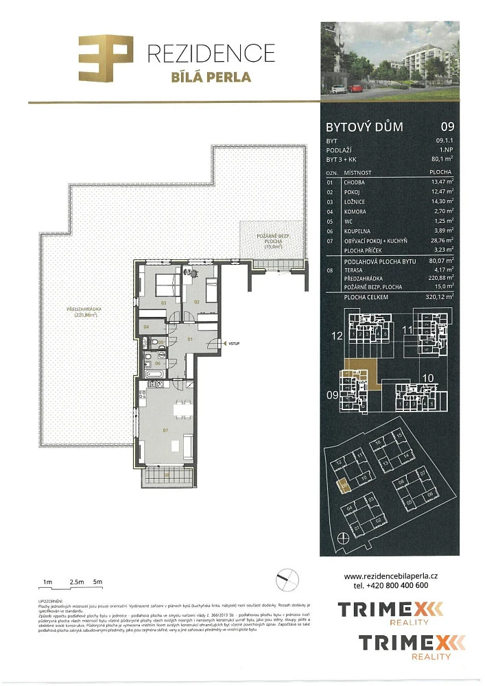 Nabízíme koupi bytové jednotky 3+kk se zahrádkou v novostavbě bytového projektu Rezidence Bílá perla ve Vančurově ulici v Opavě. Byt se nachází v přízemí. Velkým benefitem bytu je vlastní oplocená zahrádka o výměře 220 m². Vstup do zahrady je z obývacího pokoje, ložnice i dětského pokoje. Byt je vybavený kuchyňskou linkou, dále disponuje komorou, samostatným WC a koupelnou s vanou a WC. Dalším příslušenstvím bytu je stání v garážové hale a sklep za garážovým stáním.