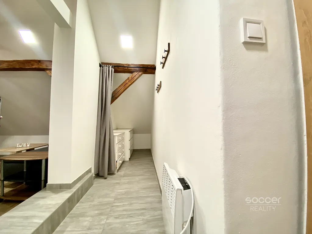Atypický ateliér, řešený jako velkorysé 1+kk+vyvýšené patro ve stylu mezonetu, je z velké části vybavený a nachází se v podkroví udržované vily s rodinnou atmosférou. Interiér se zachovanými původními dřevěnými prvky, masivním schodištěm jako stylovou dominantou a okouzlujícími výhledy do údolí Jizery i na zříceninu hradu Zvířetice, vytváří v každé denní době kouzelnou atmosféru.