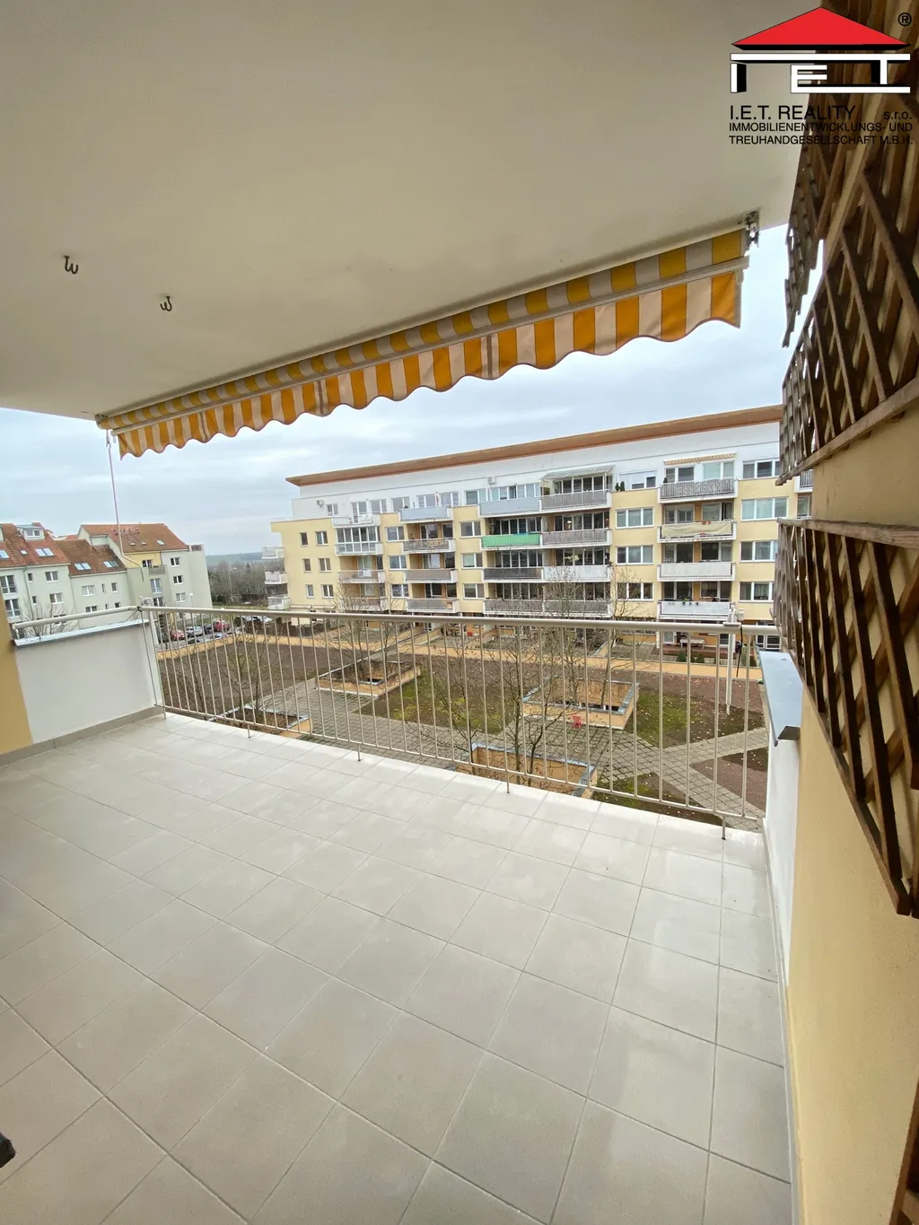 Bytová jednotka má velmi prostorný balkón s markýzou s okny do vnitrobloku.