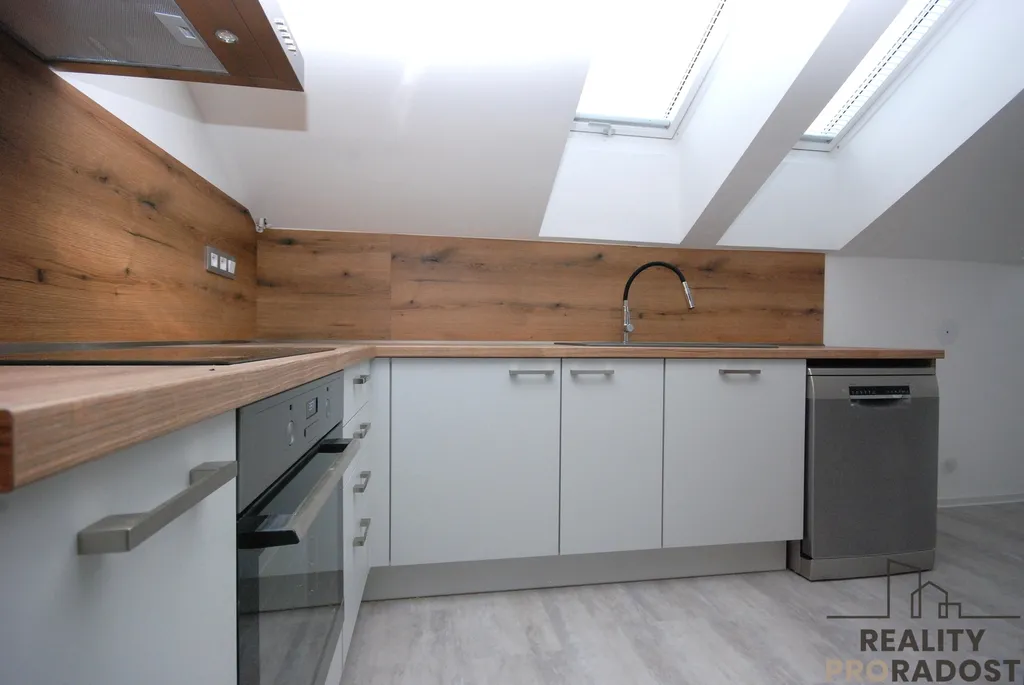 Kuchyňská linka je ve tvaru L, vybavená spotřebiči - myčka, sklokeramická varná deska, elektrická trouba, digestoř (bez lednice).