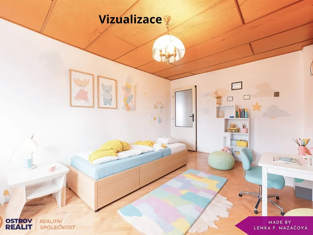 Horní patro disponuje třemi pokoji a kuchyňským koutem propojeným s obývacím prostorem, což vytváří příjemné a světlé centrum celého patra. V kuchyni se nachází také praktická spíž.