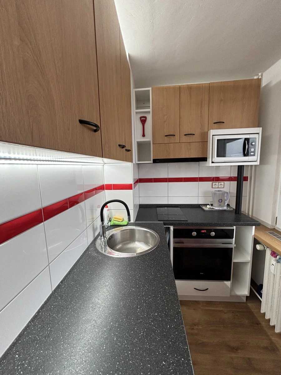 Byt je plně vybaven – součástí je kuchyňská linka včetně spotřebičů, úložné prostory, jídelní stůl a rozkládací gauč sloužící jako pohodlné spaní. Stačí se jen nastěhovat.