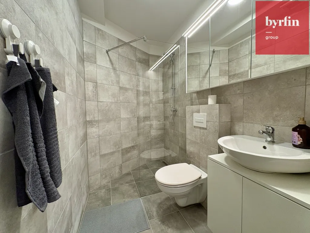 Byt se nachází v novém bytovém domě s výtahem a je téměř kompletně vybaven. Interiér byl řešen s důrazem na kvalitu a praktičnost k dispozici je vestavěný nábytek na míru, moderní kuchyňská linka rovněž vyrobená na míru s vestavěnými spotřebiči včetně myčky nádobí. V bytě je již instalována také televize.