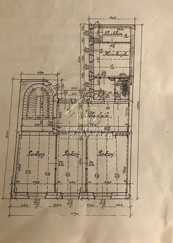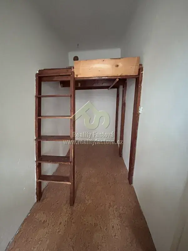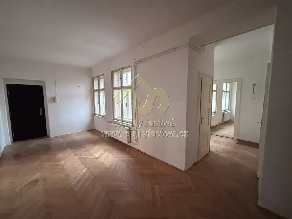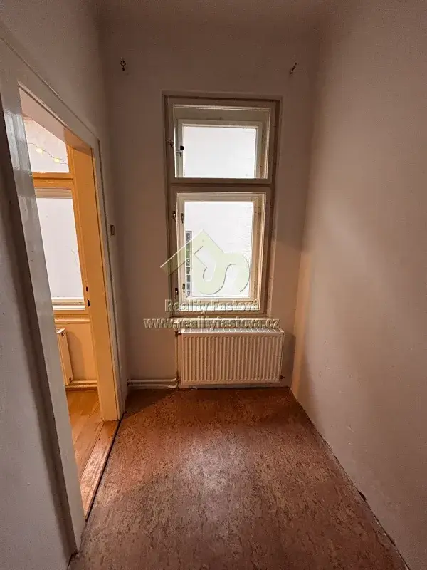 Dispoziční řešení: vstupem do bytu vejdeme do velké prostorné předsíně, která nabízí možnost rozdělení na zádveří a velkou kuchyni. Ta tam byla donedávna využívána. Dále má byt 3 velké pokoje vedle sebe, jeden je samostatný a dva průchozí. V jednom z těchto pokojů je zbudované dřevěné patro na spaní.