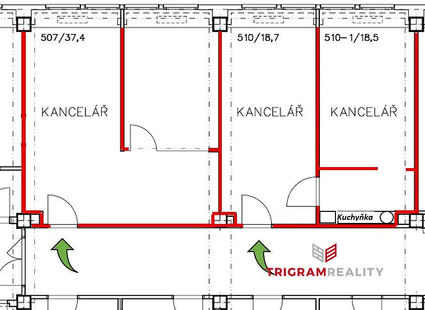 1x kancelář propojená 2×18,6 m² se společným vstupem a kuchyňkou