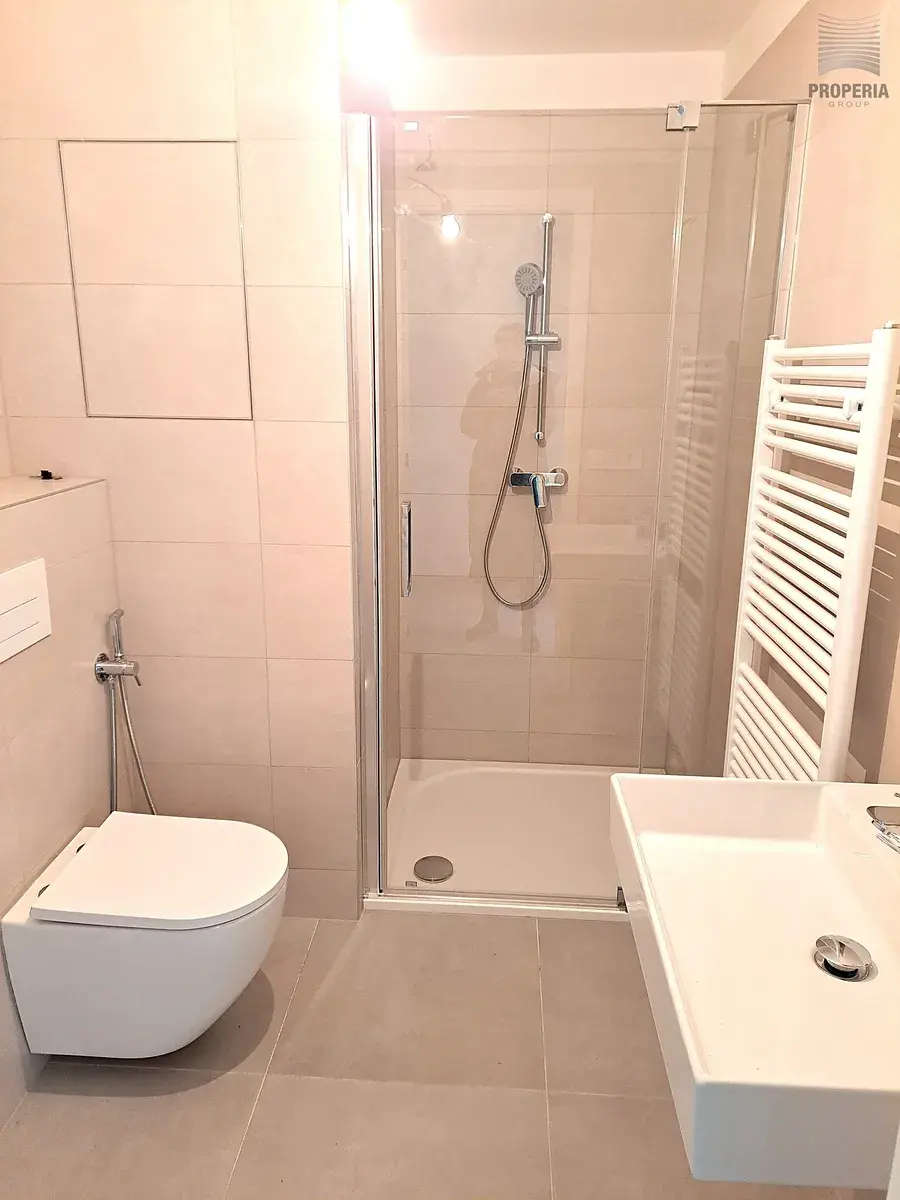 Byt je vybaven kuchyňskou linkou na míru, včetně vestavných spotřebičů – sklokeramická deska, trouba, odsavač par, mikrovlnná trouba, myčka nádobí a lednice. Koupelna disponuje sprchovým koutem, umyvadlem, toaletou, otopným žebříkem a přípojkou na pračku.