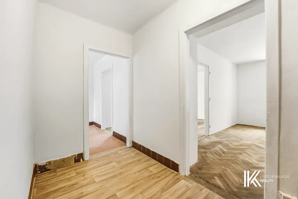 Duši bytu tvoří dva pokoje, které jsou samostatné, ale zároveň vzájemně průchozí, což ponechává budoucímu řešení příjemnou variabilitu. První pokoj je orientovaný na východ a přímo navazuje na kuchyň. Je tak ideálním místem pro obývací prostor – místo, kde se potká denní světlo, rodina i návštěvy. Druhý pokoj směřuje na jih, je zalitý světlem a teplem po většinu dne. Je menší a situovaný dále od kuchyně, vybízí tak k vytvoření tichého útočiště – ložnice s postelí u okna, šatní skříní a čtecím koutkem. Kuchyně je samostatná a orientovaná na sever. Je bez kuchyňské linky, což znamená čistý list papíru – můžete si ji navrhnout přesně podle svého vkusu. Koupelna je společná s toaletou a čeká na kompletní proměnu. Hned vedle koupelny se nachází malá komora, která může sloužit jako praktická spíž, technická místnost nebo místo na pračku a úklidové potřeby. Vše propojuje vstupní prostorná předsíň. Díky své velikosti to není jenom průchozí prostor, ale místo, kde si můžete vytvořit praktické úložné zázemí – velkou šatní skříň s botníkem, věšáky apod. Tento prostor dává bytu příjemný pocit vzdušnosti již od prvního kroku dovnitř.