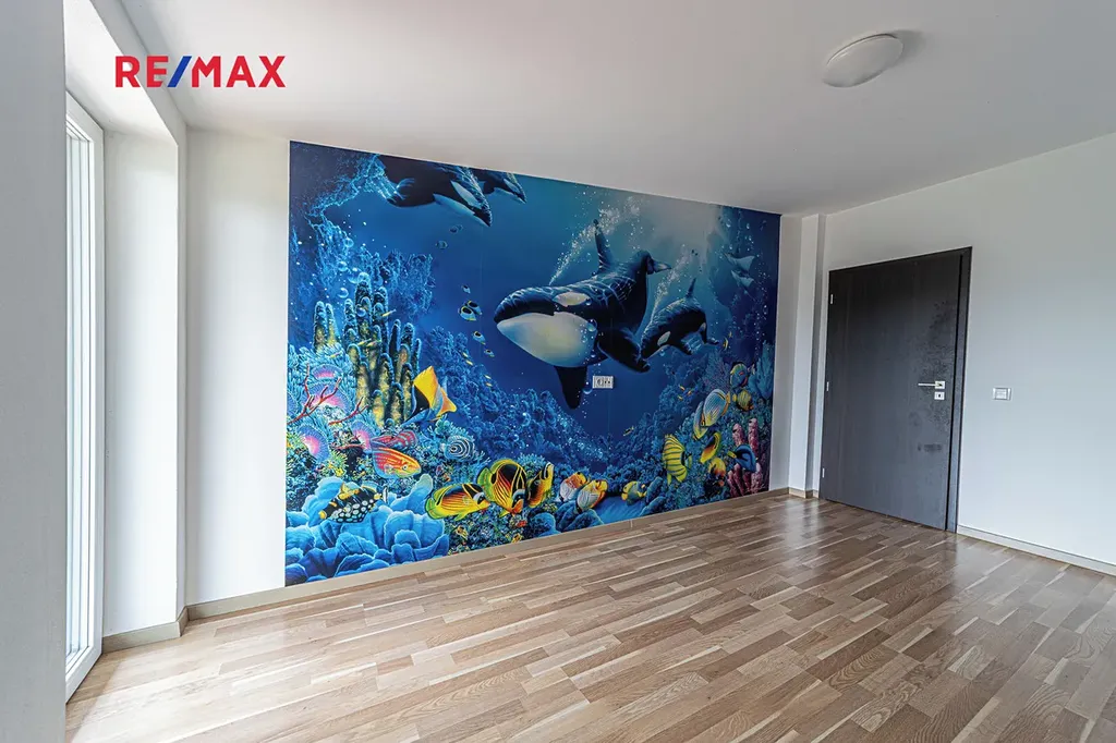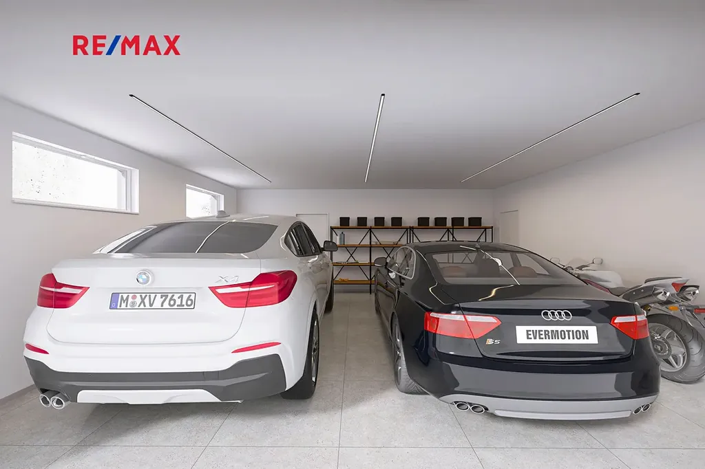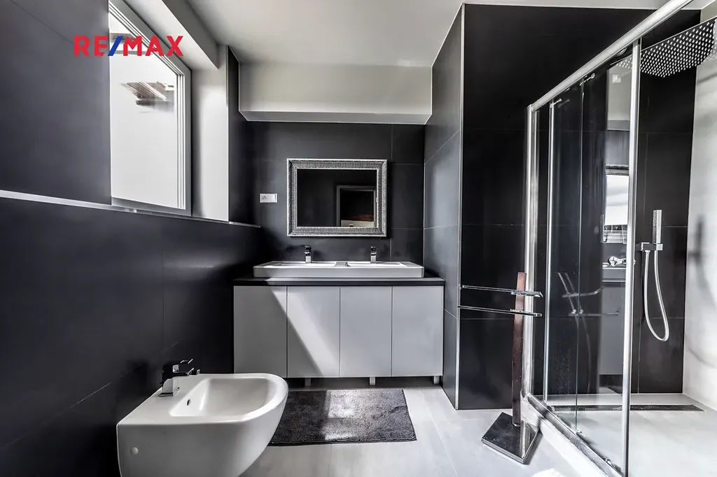 V přízemí domu je samostatná bytová jednotka 1kk včetně koupelny a samostatného wc. Dále je zde prostorná dvougaráž, dílna, sklad na sportovní potřeby a technická místnost, ve které se mimo jiné nachází řídící jednotka fotovoltaické elektrárny umístěné na střeše domu s výkonem 20 kw. Ve druhém a třetím podlaží se nachází opravdu nadstandardně řešený byt 7kk. Při vstupu do tohoto bytu máme hned v prostoru zádveří pracovnu a šatnu, dále se pak otvírá obrovský prostor, který propojuje kuchyň s varným ostrůvkem, jídelnu a obývací pokoj, který je otevřený do galerie do dalšího podlaží. Na tomto patře se dále nachází master bedroom s privátní koupelnou a také samostatná toaleta pro návštěvy. Po vzdušném a světlém schodišti vystoupáme do horního podlaží, kde se nachází soukromá zóna majitelů, kde máme k dispozici krom již zmíněné prostorné koupelny s vanou a sprchovým koutem také další šatnu a 4 pokoje. V tomto podlaží mají téměř všechny pokoje včetně koupelny přes francouzská okna přístup na balkóny, obepínající celou jihozápadní stranu domu.