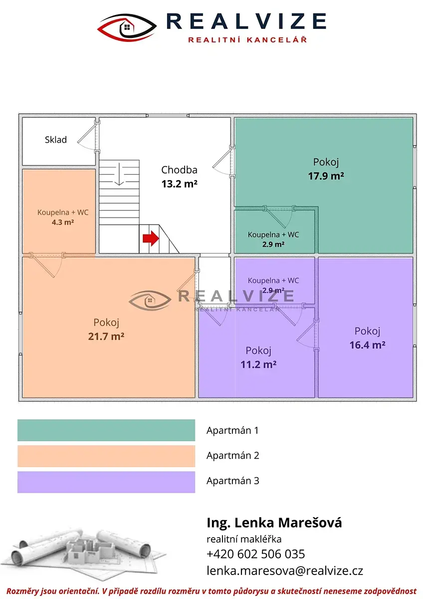 - Tři vkusně zařízené apartmány s kapacitou 11 lůžek (4+4+3)