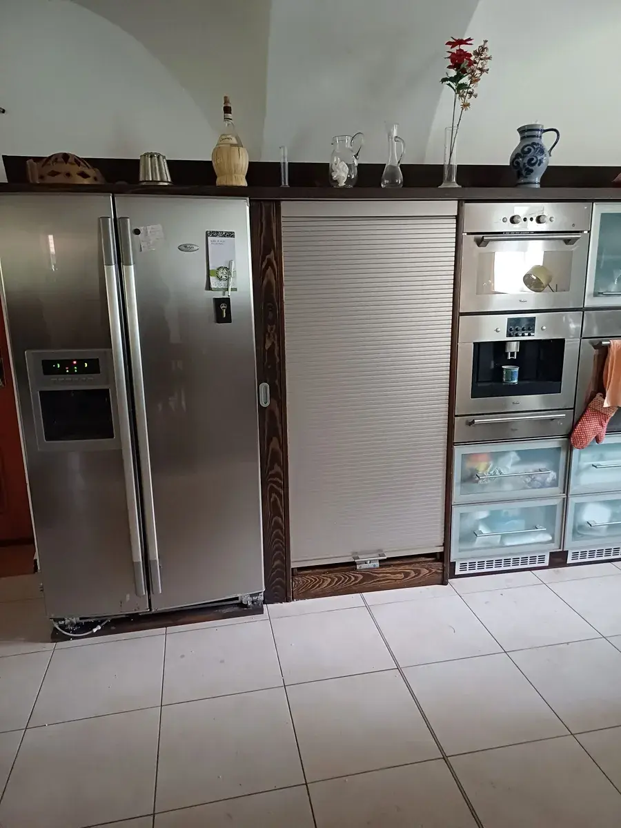 V 1.NP se nachází jídelna s klenutými stropy, kuchyně s vybavenou kuchyňkou linkou, dvoudílnou americkou lednicí, mikrovlnnou troubou, kombinovanou varnou deskou, ohřívacím šuplíkem, kávovarem a elektrickou troubou, posezení u krbu na tuhá paliva a otočné schodiště vedoucí do 2.NP.