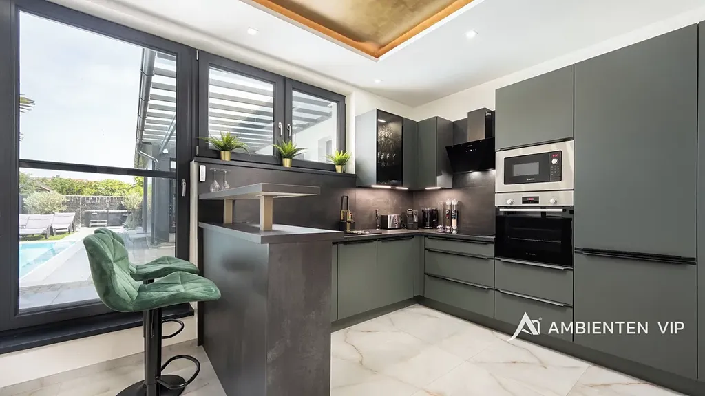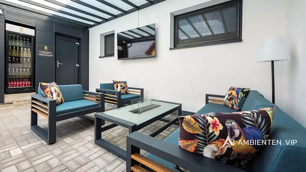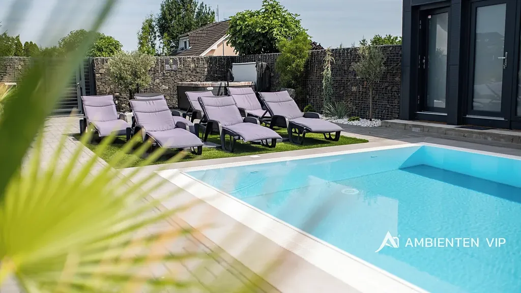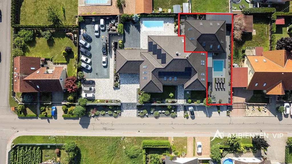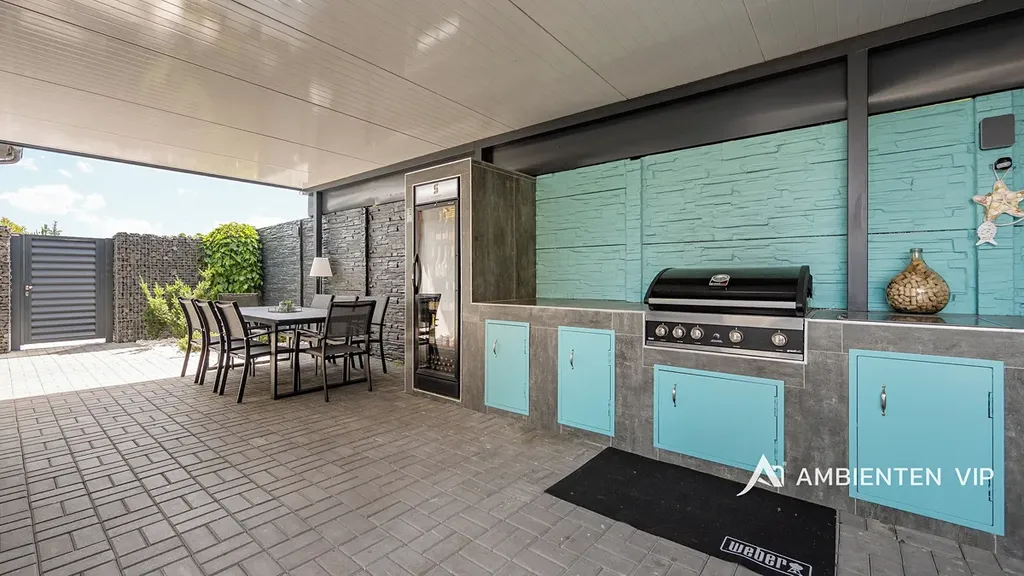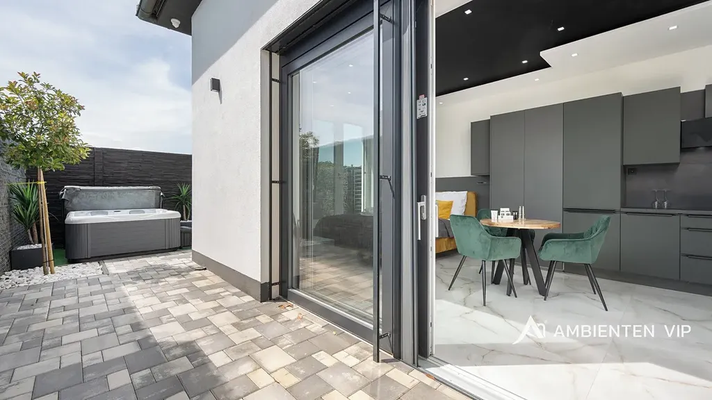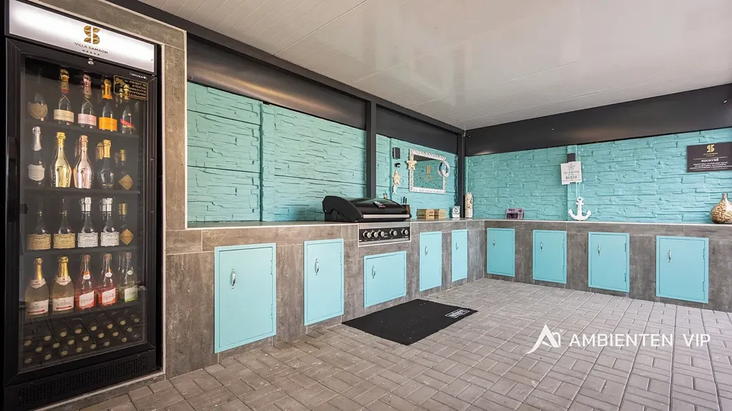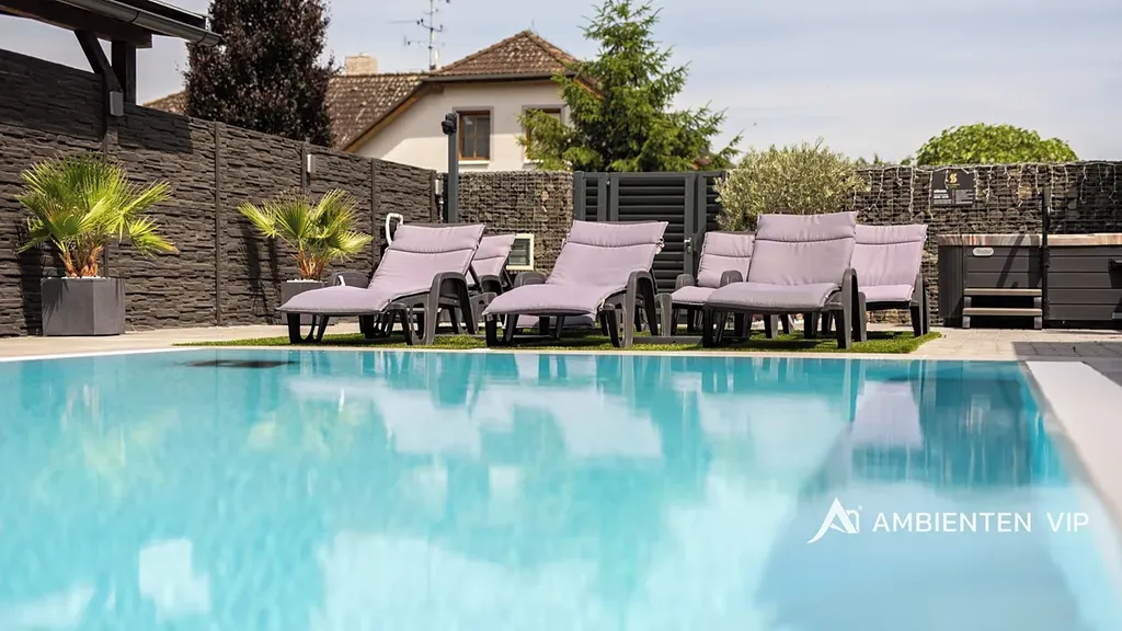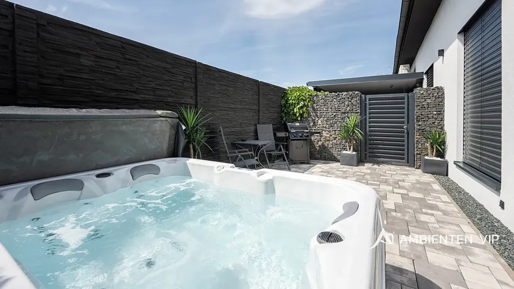 Návštěvníkům apartmánů je k dispozici venkovní kuchyně s grilem a další vířivka. Součástí nemovitosti je bazén o rozměru 6,5 × 4 metry s protiproudem. Celý prostor lze zakódovat pomocí zabezpečovacího systému Jablotron a chráněn je také kamerovým dohledem. V každém detailu je patrné, že nemovitost byla navržena s důrazem na funkčnost a komfort. Parkování pro 3-4 osobní automobily je přímo před pozemkem.