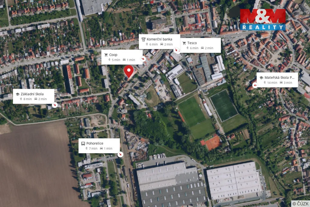 V Pohořelicích je veškerá občanská vybavenost. Dostupnost do Brna autem je přibližně patnáct minut.