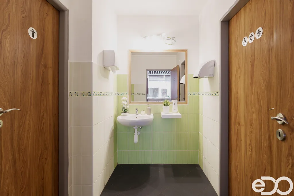 Samozřejmostí je kompletní zázemí – toalety pro klienty i zaměstnance, sklad, šatna, kancelář, místnost pro personál i zádveří.
