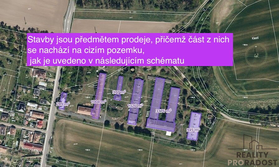 Část staveb se nachází na cizích pozemcích, avšak toto umístění je legalizováno platnými nájemními smlouvami, které lze převzít.