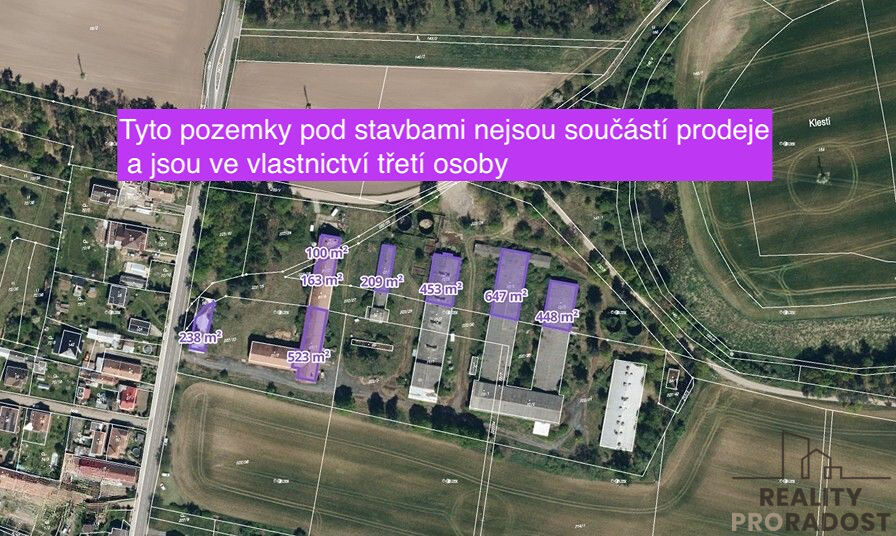 Část pozemků pod samotnými stavbami nejsou součástí prodeje a jsou ve vlastnictví třetích osob – viz samostatné grafické schéma.