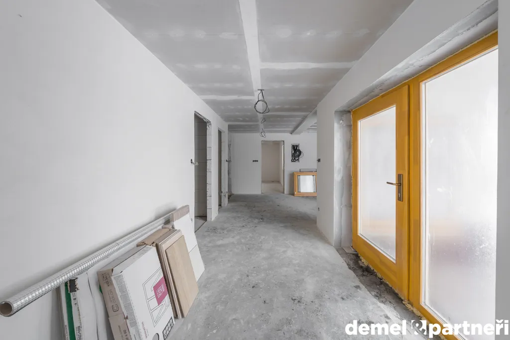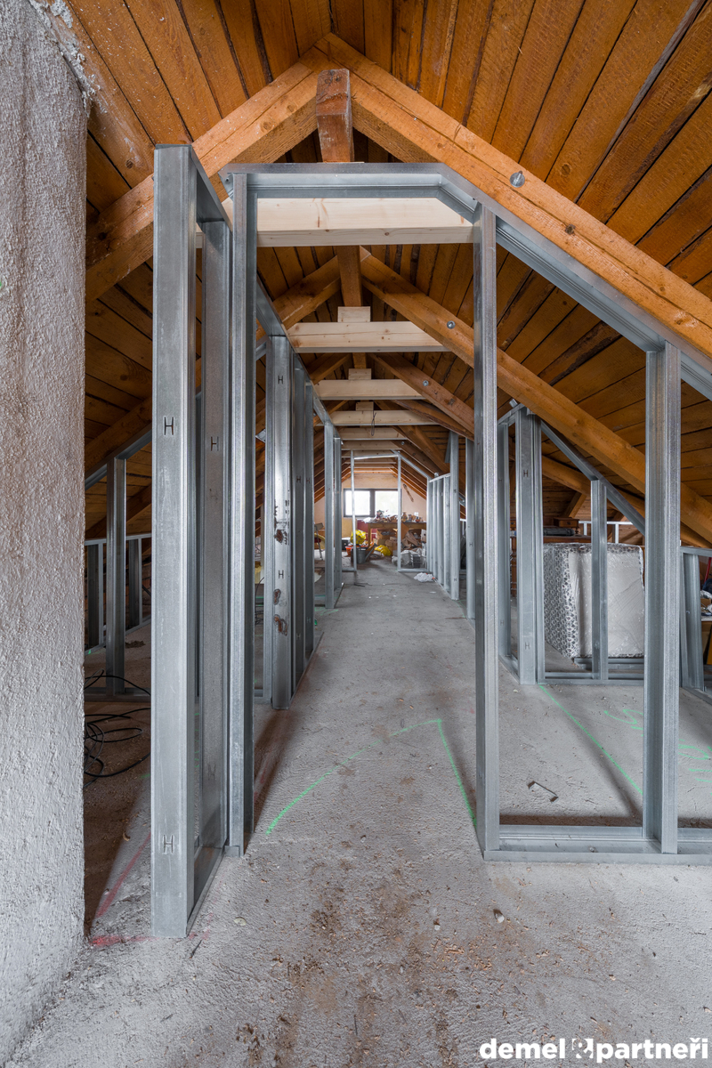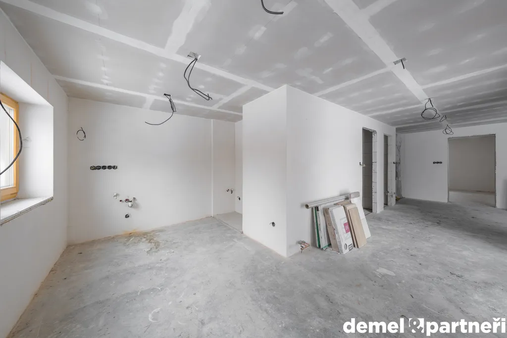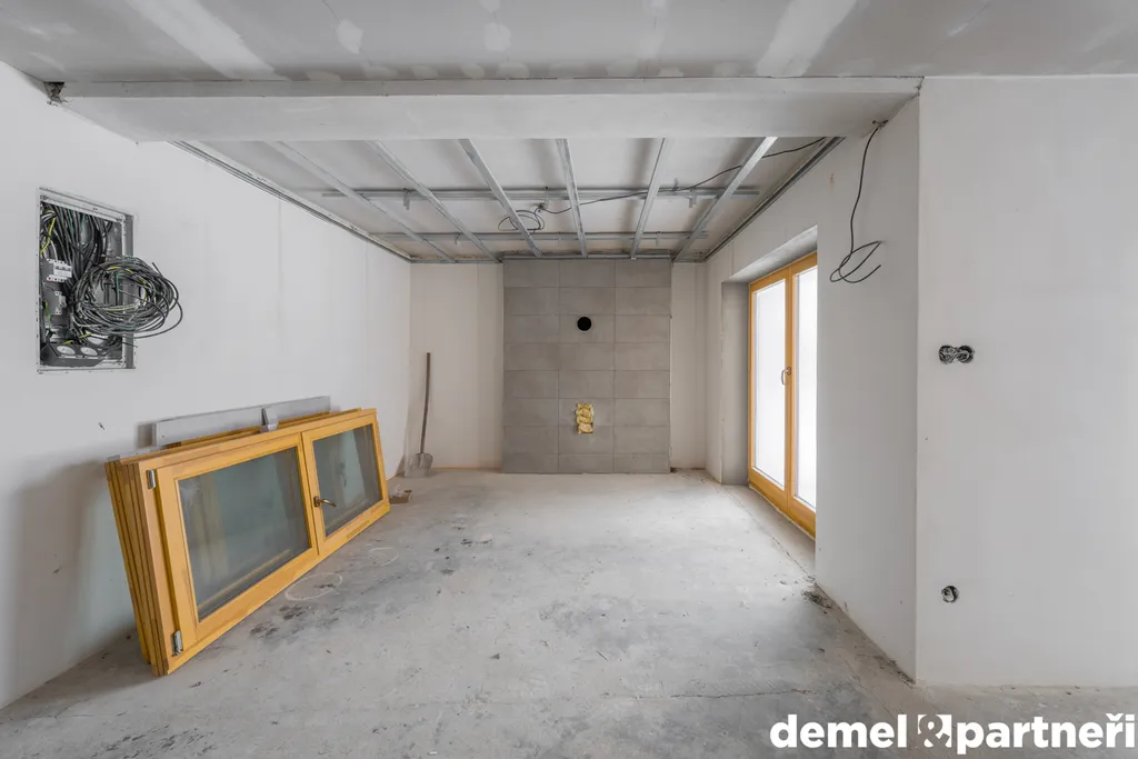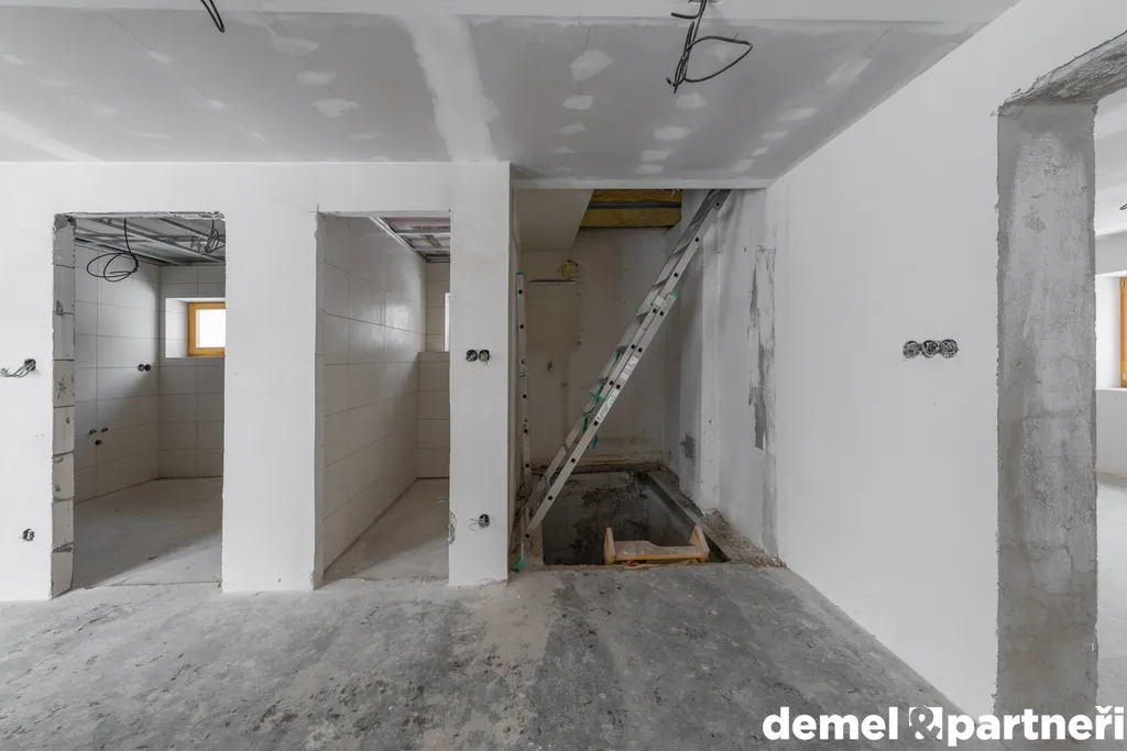 Vstupujeme do prostoru chodby mezi kuchyní a obývacím pokojem, kde dále najdem oddělenou toaletu, koupelnu a místo pro schody do sklepa a do podkroví. Dispozičně bude ideální dům dokončit jako 4+kk, ale může to být klidně i jen 3 kákáčko. Můžeš to ale opravdu předělat podle sebe, protože celkem 160 m² včetně sklepa je opravdu štědrá výměra. Teď jsou v domě dokončené omítky, hrubé rozvody elektra, vody a odpadů. Připravený komín na krbová kamna. Dům se dá vytápět případně i plynovým kotlem. To je už jen a jen na tobě. Z venku jsou osazená nová dřevěná okna. Jinak je to bez zásadních úprav. Ale to jde krásně vidět na fotkách.