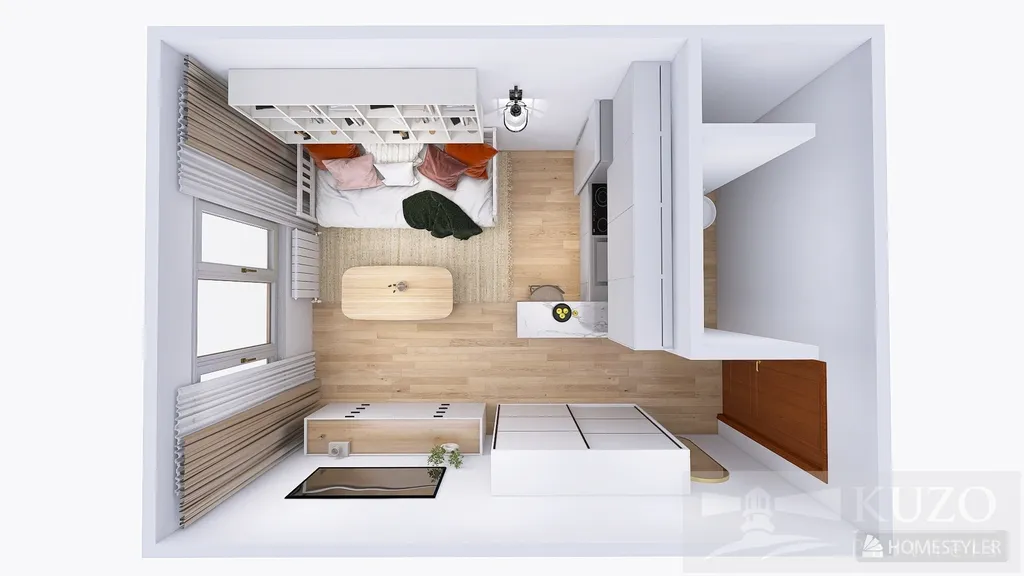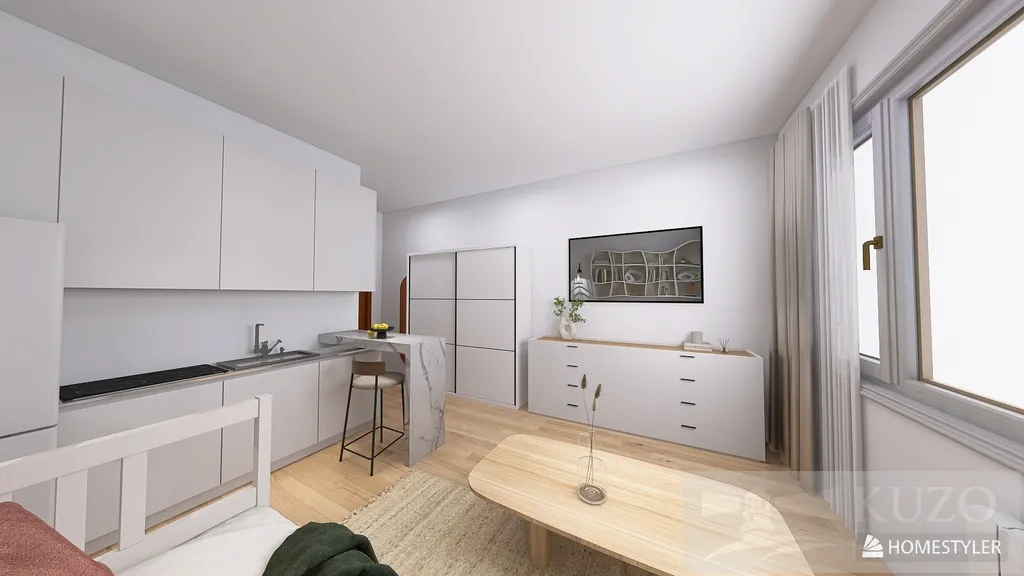 Byt je světlý díky velkému oknu, které je vybaveno elektronickou venkovní roletou, a nabízí praktickou dispozici umožňující oddělení obytné a kuchyňské části. Nachází se v udržovaném domě se dvěma vstupy, což zvyšuje komfort a dostupnost.