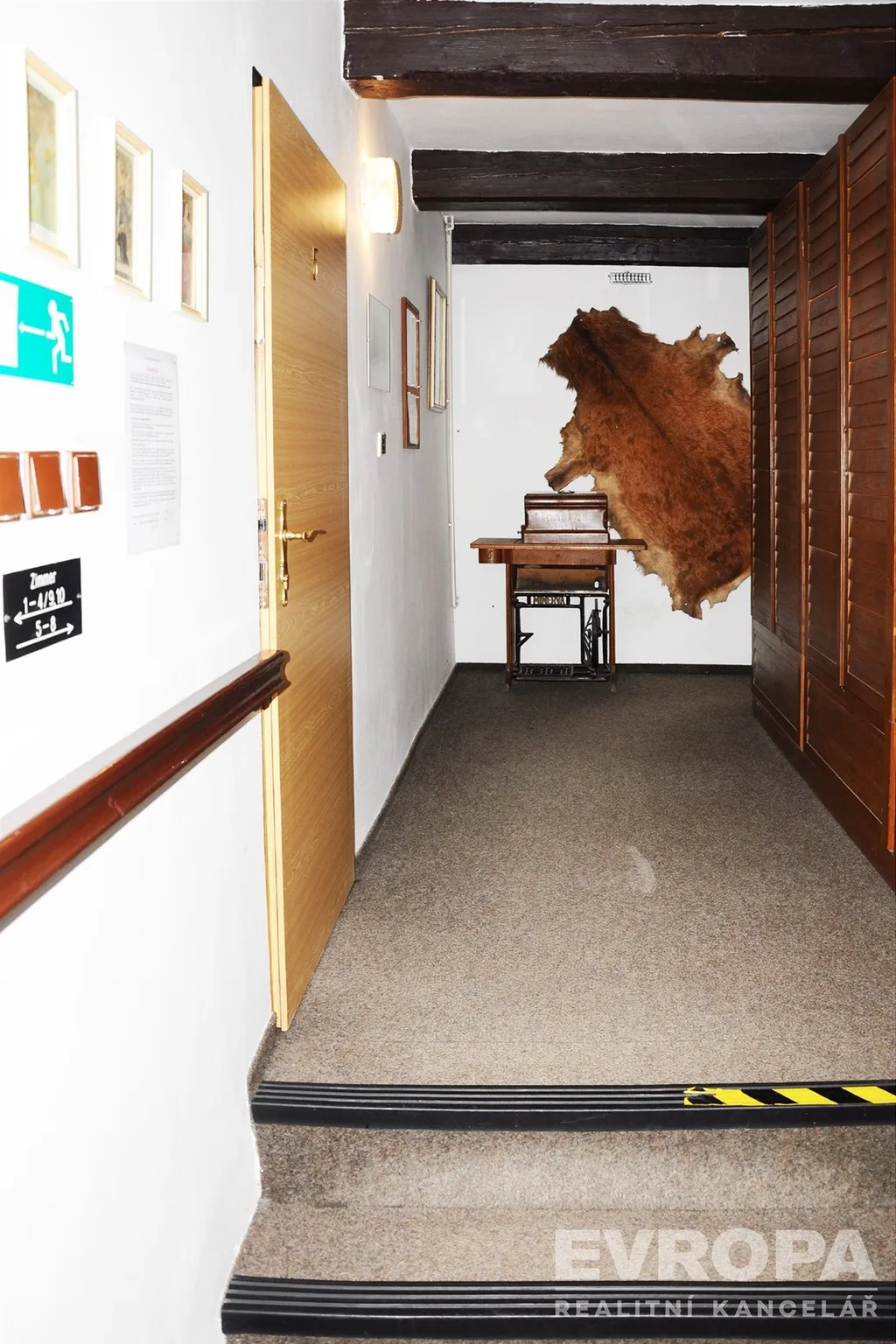 V patře chodba se schody do podkroví, 8 pokojů (7x2 a 1x3) lůžka, s vlastní koupelnou se sprchovým koutem a WC, prádelna, výstup na venkovní terasy nad sklady.